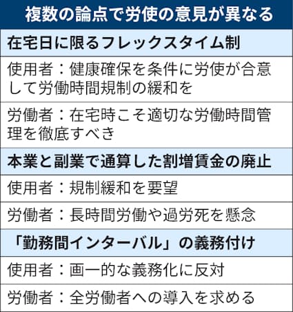 28日の分科会では、経団連労働法制本部長が、報告書に盛り込まれなかった裁量労働制の対象拡大や在宅勤務における深夜労働の割増賃金の見直しなどについても論点とするよう求めた。連合総合政策推進局長は「スケジュールありきではなく、職場の実態を踏まえた議論をしてほしい」と要望した。